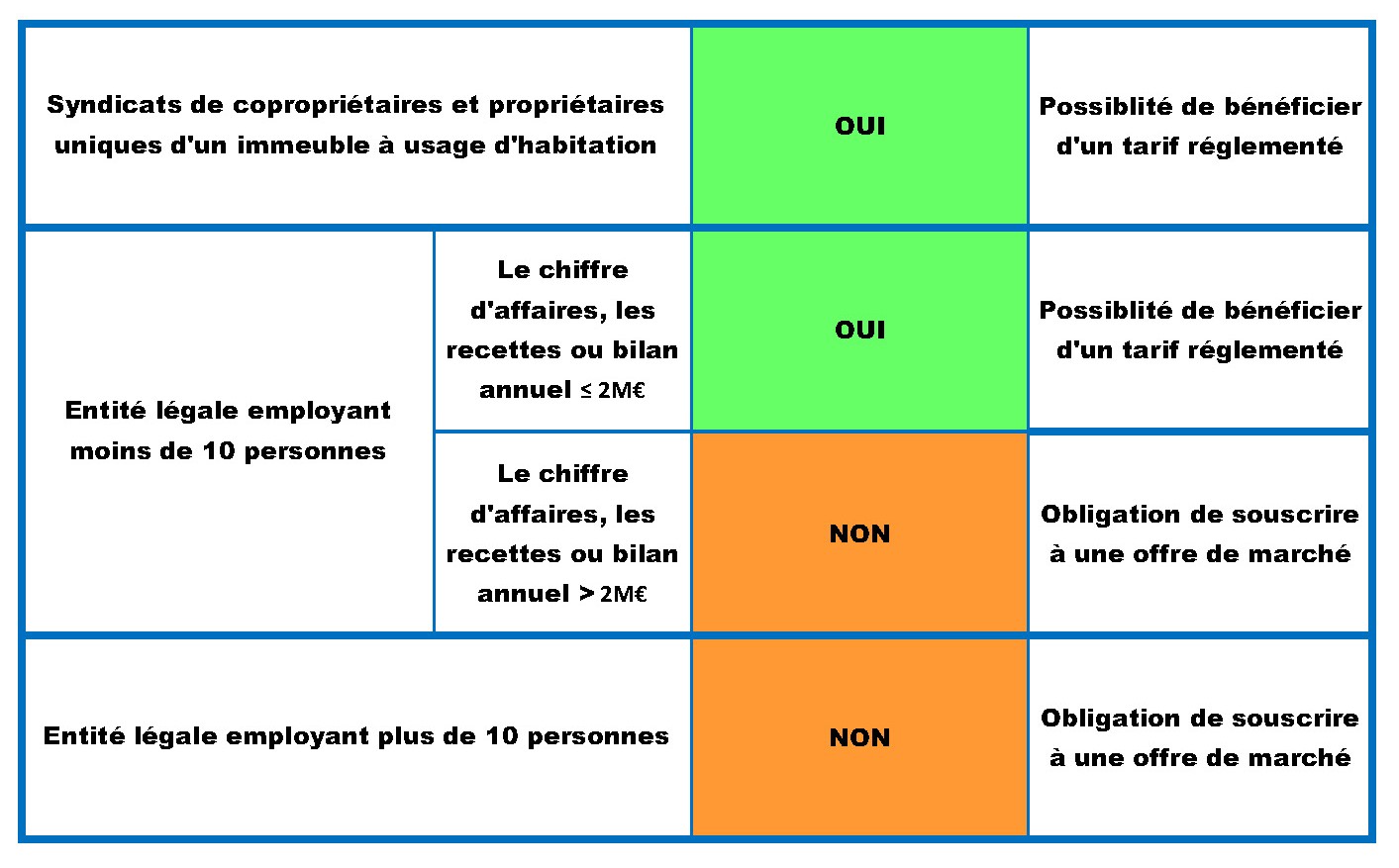 - aux consommateurs finals non domestiques qui emploient moins de 10 personnes et dont le chiffre d’affaires, les recettes ou le total de bilan annuels n’excèdent pas 2 millions d’euros,